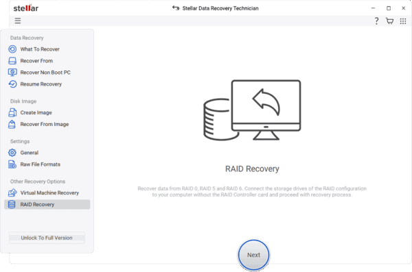 Specialized RAID data recovery software handles these situations. Tools like Stellar Data Recovery Technician recover data from failed RAID 0, 5, 6, or hybrid arrays. The software scans member drives, creates virtual images based on RAID parameters, and recovers data without a full rebuild. Built-in drive monitoring verifies member drive health before recovery.